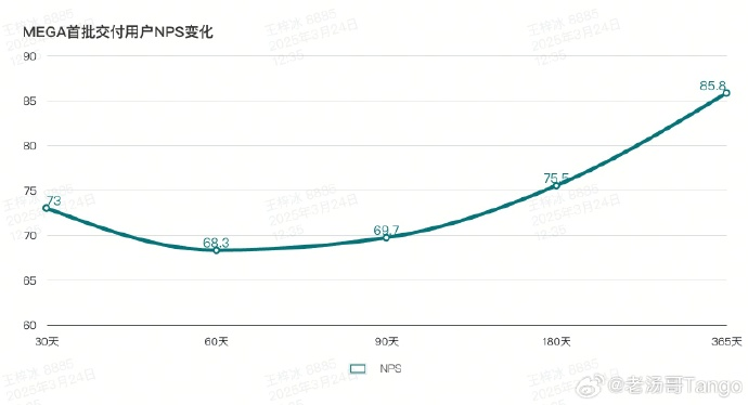 通过对MEGA首批交付用户进行持续的NPS调研追踪,发现MEGA在舆论承压期间NPS触底,后续随着OTA升级、充电网络建设和APP充电规划体验优化,MEGA用户NPS逐渐提升。2025年3月,MEGA的NPS达到85.8,成为理想汽车全系车型NPS最高的一款车型。