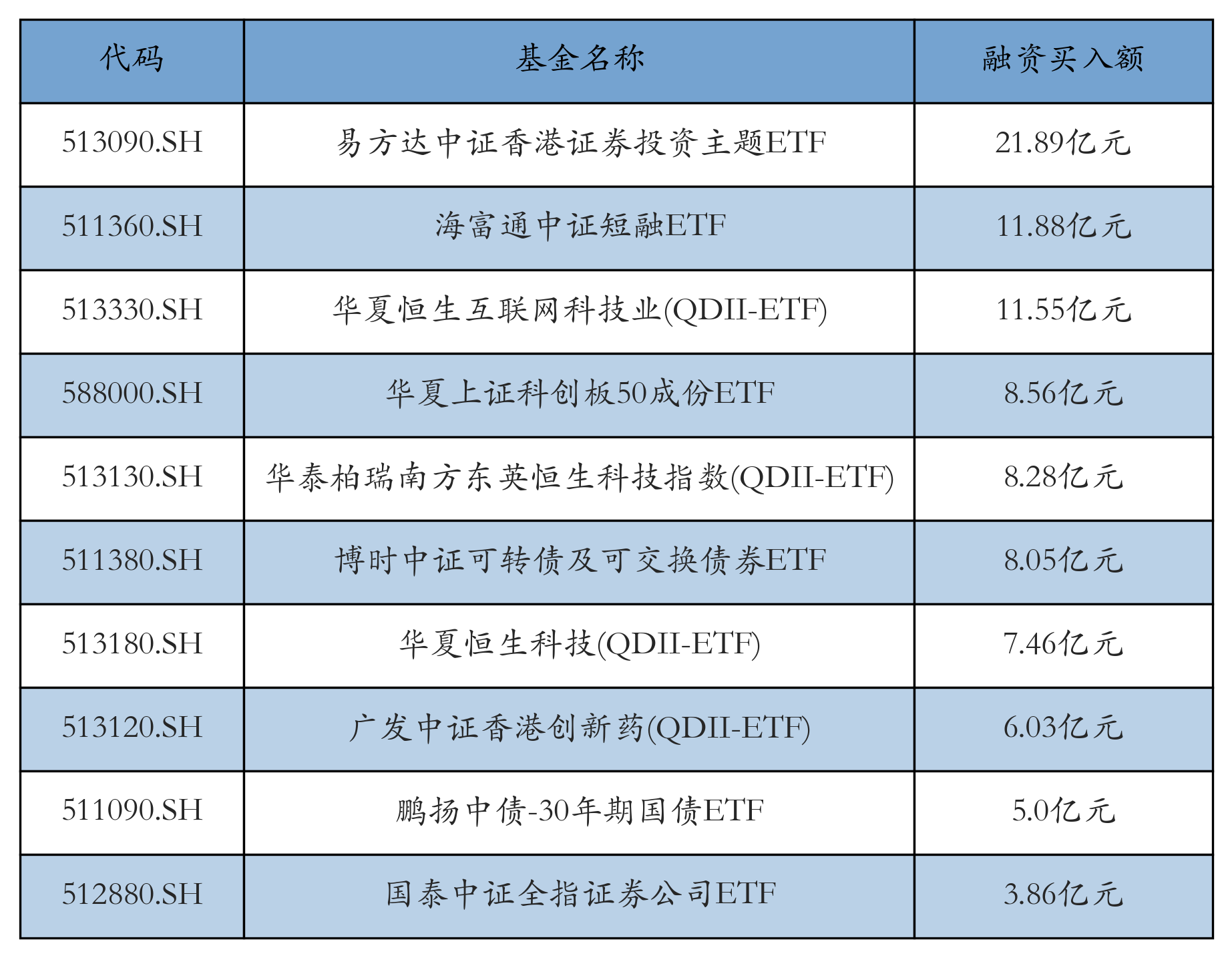7月23日ETF融资买入额前三位分别为:易方达中证香港证券投资主题ETF(21.89亿元)、海富通中证短融ETF(11.88亿元)和华夏恒生互联网科技业(QDII-ETF)(11.55亿元),前10具体见下表: