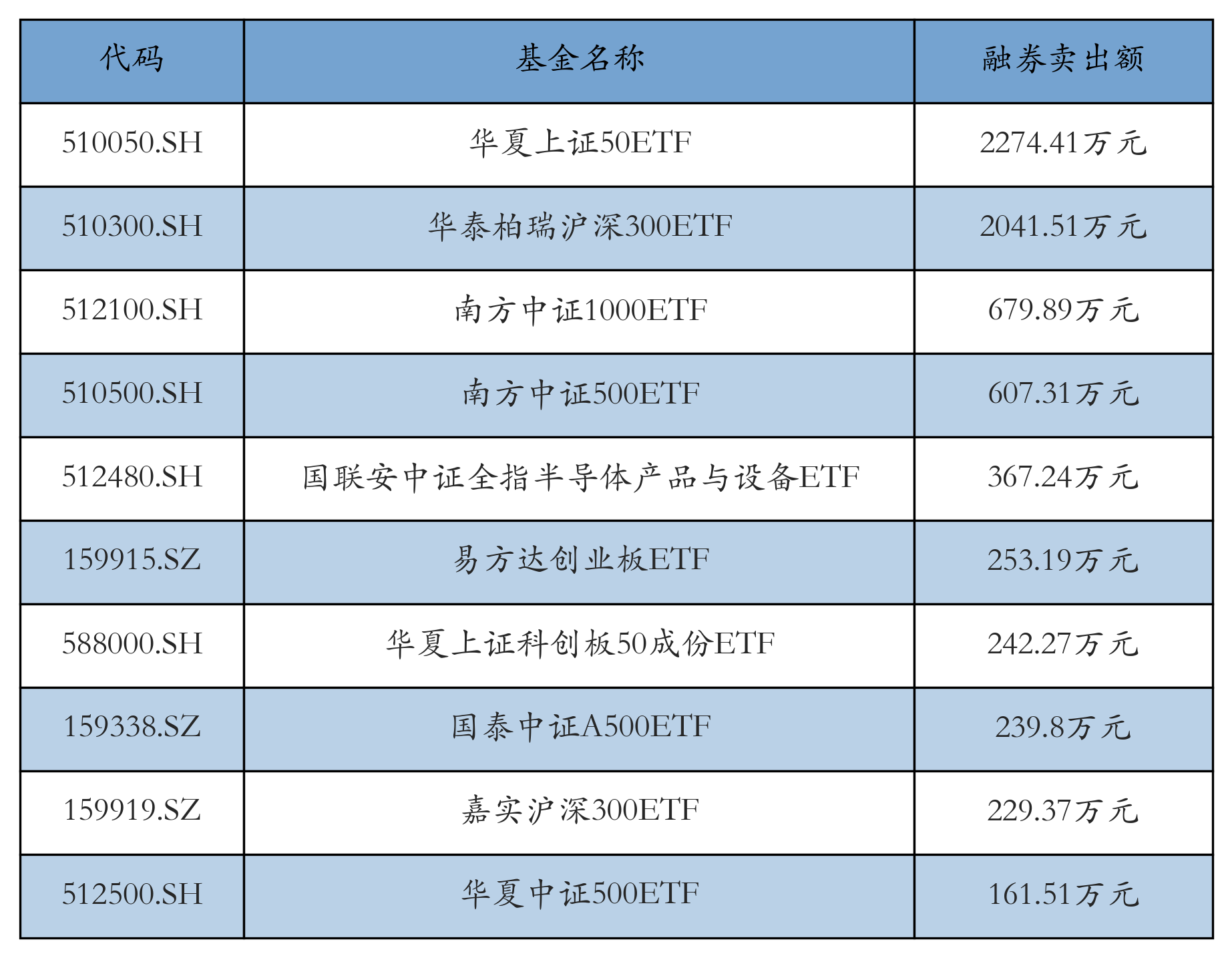 7月23日ETF融券卖出额前三位分别为:华夏上证50ETF(2274.41万元)、华泰柏瑞沪深300ETF(2041.51万元)和南方中证1000ETF(679.89万元),前10具体见下表: