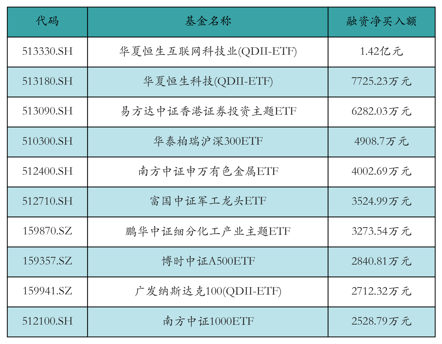 7月23日ETF融资净买入额前三位分别为:华夏恒生互联网科技业(QDII-ETF)(1.42亿元)、华夏恒生科技(QDII-ETF)(7725.23万元)和易方达中证香港证券投资主题ETF(6282.03万元),前10具体见下表: