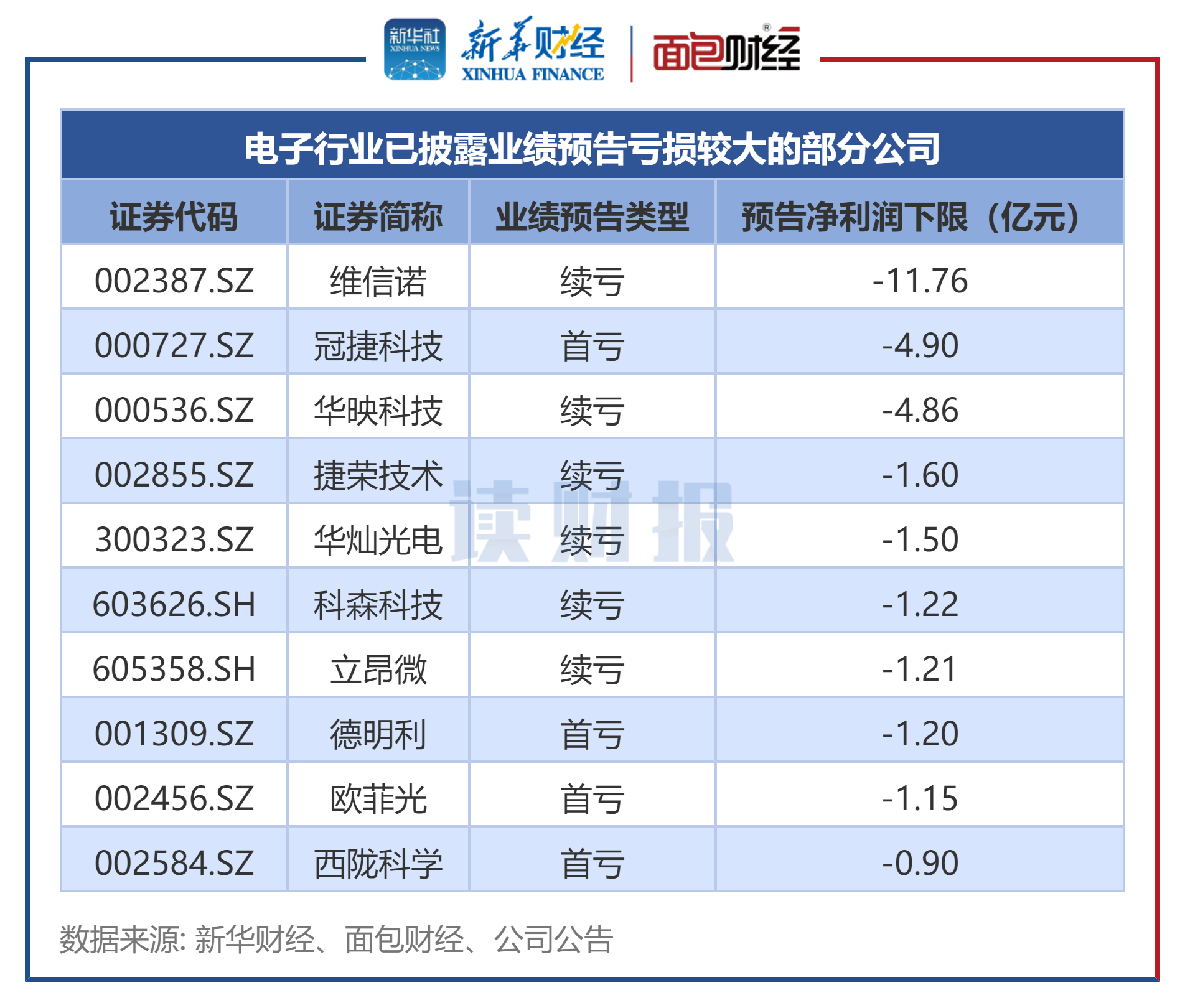 统计数据显示,电子行业所有公布业绩预告的公司中有27家亏损。其中,预告净利润下限排名前三位的公司分别为维信诺、冠捷科技及华映科技。