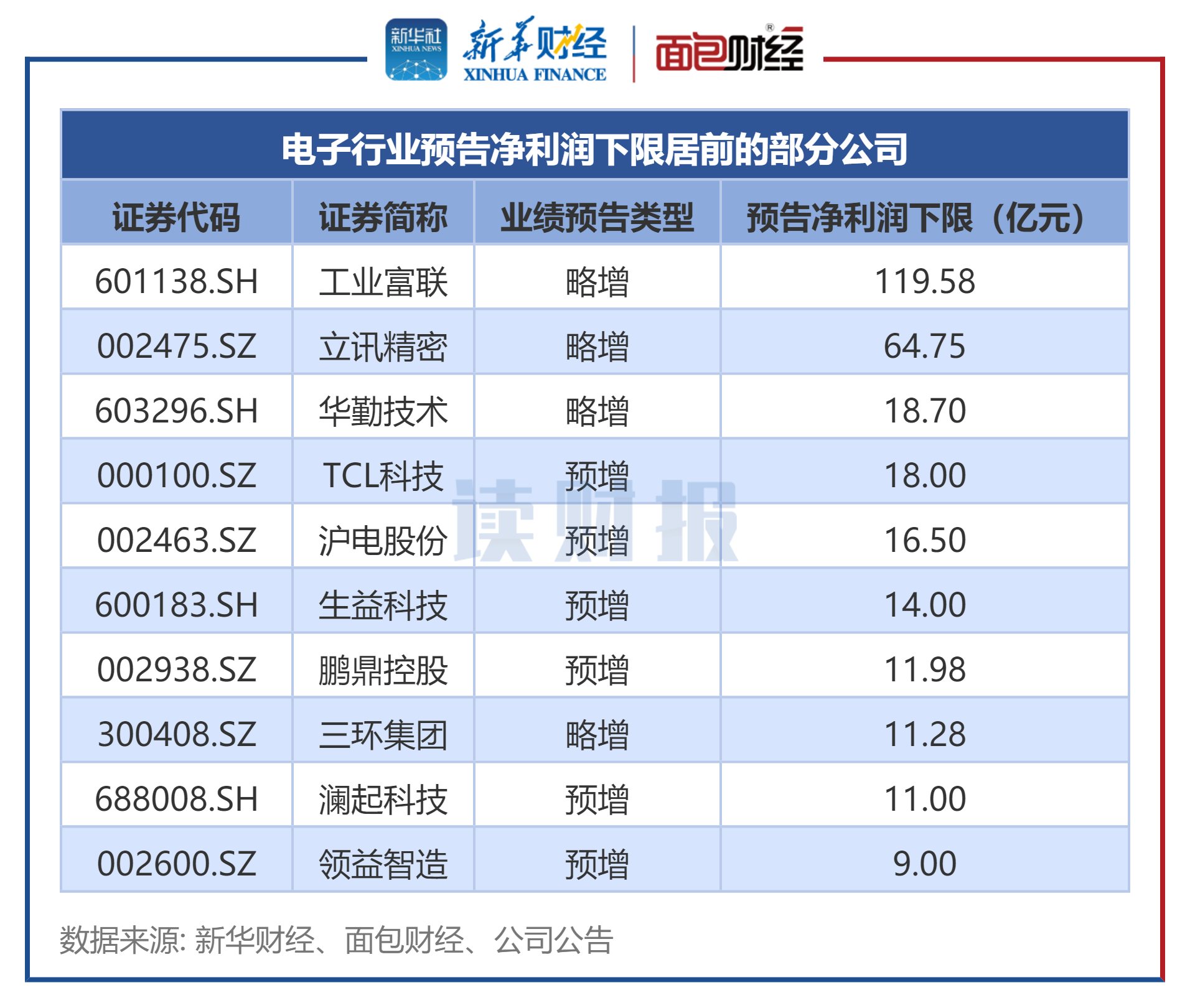 数据显示,工业富联、立讯精密、华勤技术的预告净利润规模下限位列前三。