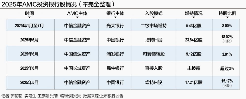 近期,上市银行一系列密集的股权变动引发市场强烈关注:7月末,光大银行披露中信金融资产持股比例提升至8%,同期中国银行H股公告显示中信金融资产的持股比例增至18.02%;6月底,中国信达资产将117.85亿元浦发转债转换为9.12亿股A股,成功跻身浦发银行前十大股东;中国长城资产则通过提名高管出任民生银行非执行董事强化公司治理参与。