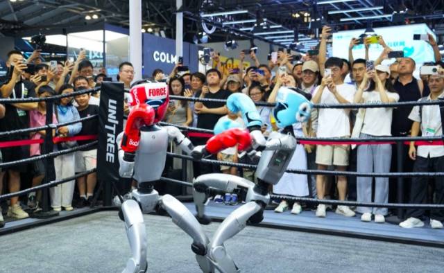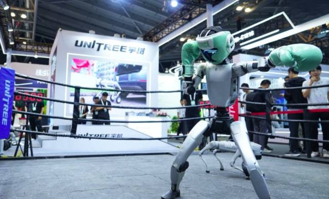 身高1.32米、重35公斤的G1格斗机器人凭借29个灵活关节和智能平衡算法,在展台演绎行云流水的拳击连招、干净利落的回旋踢,即使被“偷袭”也能迅速调整平衡。当其意外摔倒时,动态平衡系统仅用数秒便完成自主起身,裁判读秒手势未落已恢复战斗姿态,活脱脱一个“AI版李小龙”。