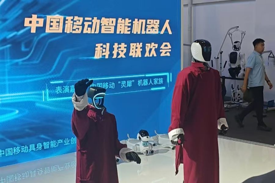 中国移动的展位上,人形机器人穿着红色大褂开启了相声演讲,机器狗集体表演倒立;中国联通的展位上,人形、半人形和机械臂在流水线上展示搬运能力,彼此合作无间……