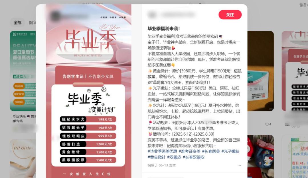 医美机构显然深谙时间就是商机的道理。早在五月份就开始布局“暑期档”营销策略,部分机构甚至推出“暑期焕颜专享”,将双眼皮、开眼角、祛脂祛皮等项目组合打包,学生则可以凭借学生证享受专属优惠。