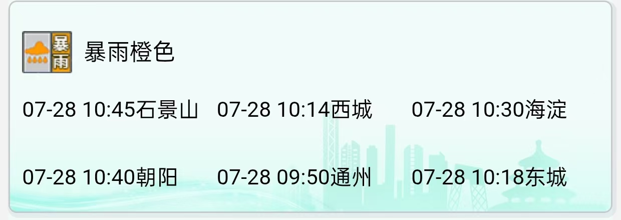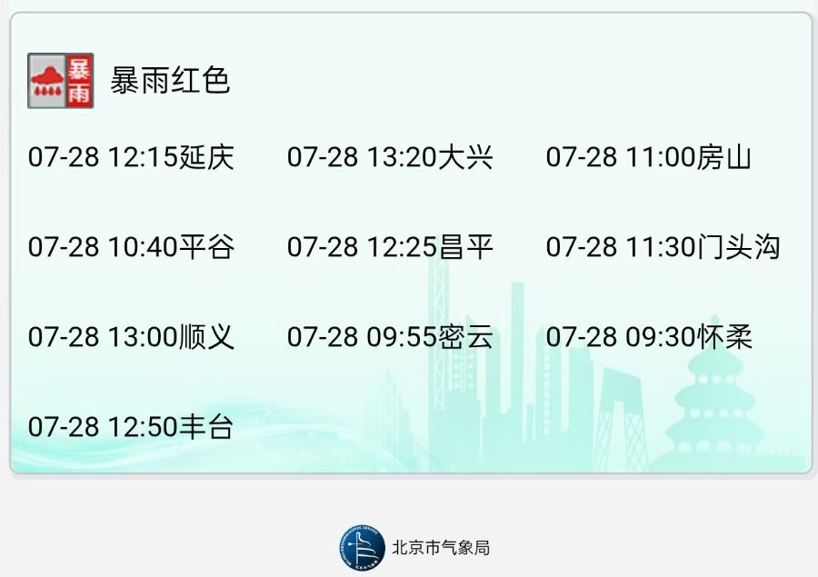 7月28日12时00分,北京市气象台升级发布暴雨红色预警信号,预计信号发布时至29日10时,北京市大部分地区将出现暴雨天气,其中密云、平谷、怀柔、顺义、房山、门头沟、延庆、昌平、海淀等区的部分地区6小时累计雨量可达100毫米以上,个别点可达250毫米以上,山区及浅山区出现山洪、泥石流、滑坡等灾害的风险极高,低洼地区可能出现积水,请注意防范。