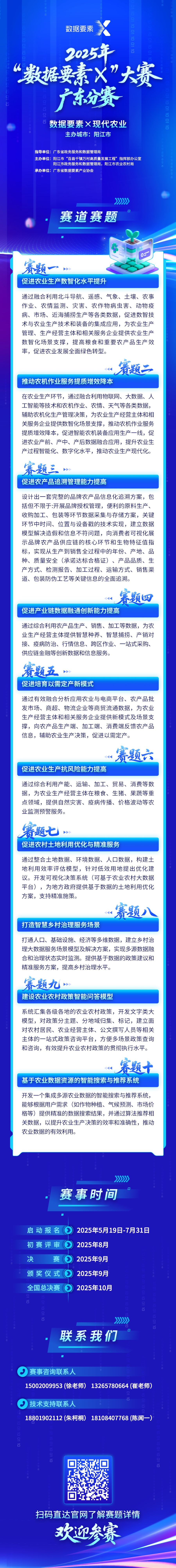 现代农业赛道详情如下。10个赛题汇聚农业领域数据先锋,深挖数据技术在农业生产模式创新、智慧农田、产业链优化等领域的应用潜力,赋能经济社会高质量发展。欢迎有意向的单位或个人通过广东分赛官方平台(http://www.gdsjyscds.com)报名,参赛要求和评选规则可在官网查询。报名截止日期为2025年7月31日。