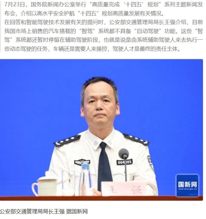 还有另一方面是因为这是带有官方背书性质的测试,无论是央视和懂车帝联合(虽然最后删去合作,但还是起到了传播背书),还是封闭部分高速公路测试,这都不是一般的商业媒体能够做到的。更不要说在测试发布后,公安部交通局局长王强在新闻发布会上明确表示:“目前我国市场上销售的汽车搭载的‘智驾’系统都不具备‘自动驾驶’功能”。他重申驾驶人始终是行车安全的第一责任人,脱手脱眼将面临法律风险。