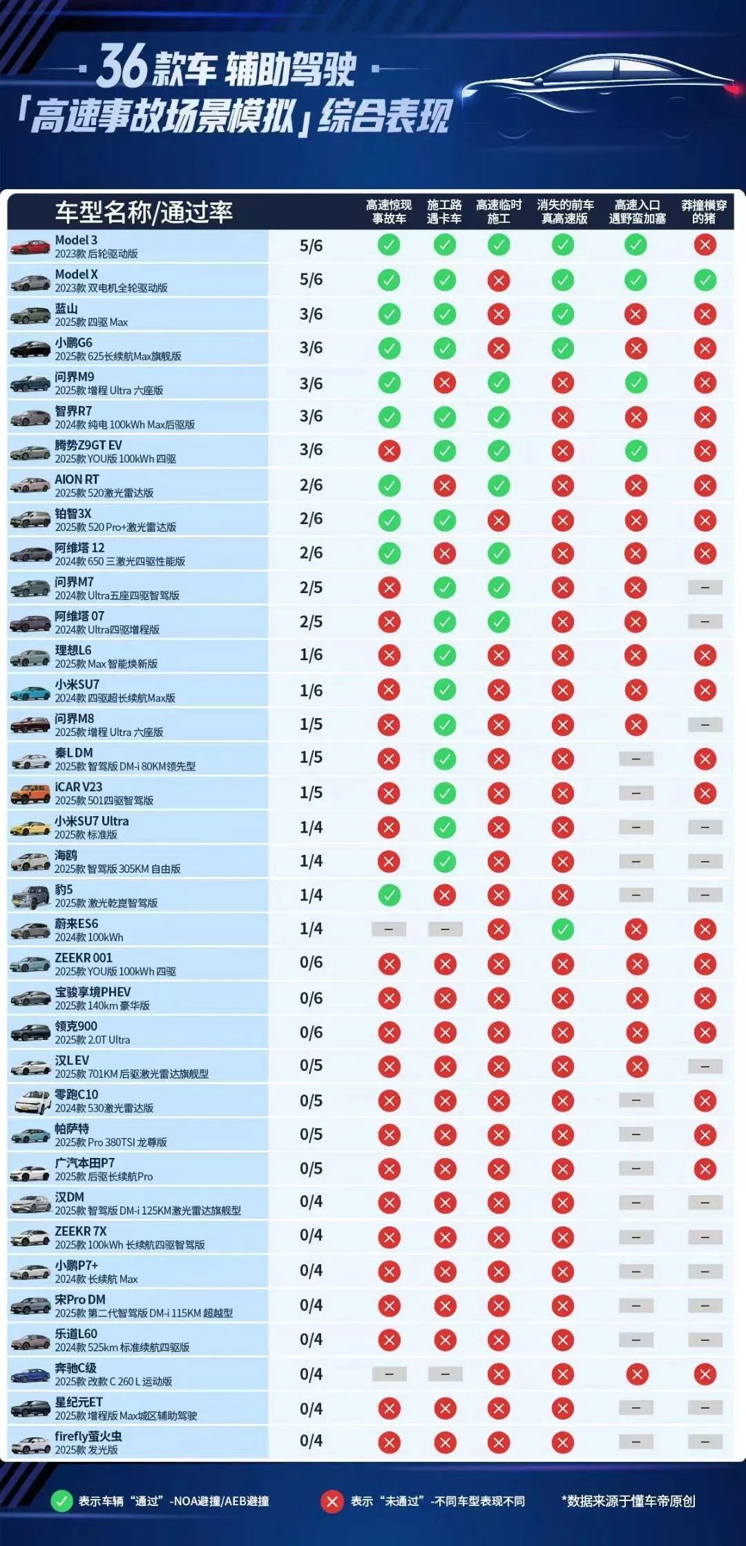 辅助驾驶系统受到传感器瞬时状态、算法决策细微差异的影响,本身存在一定概率性,懂车帝只测试一次测试的成功或者失败,很难真实代表该车型在该场景下的稳定能力,这也让排名和“通过率”的统计意义大打折扣。