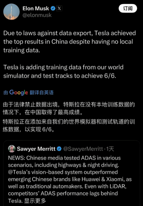 7月25日,特斯拉CEO马斯克还转发了懂车帝《懂车智炼场》辅助驾驶科普节目的高速公路场景的测试视频,并配文称:“由于法律禁止数据出境,特斯拉在没有本地训练数据的情况下,在中国取得了最高成绩。”