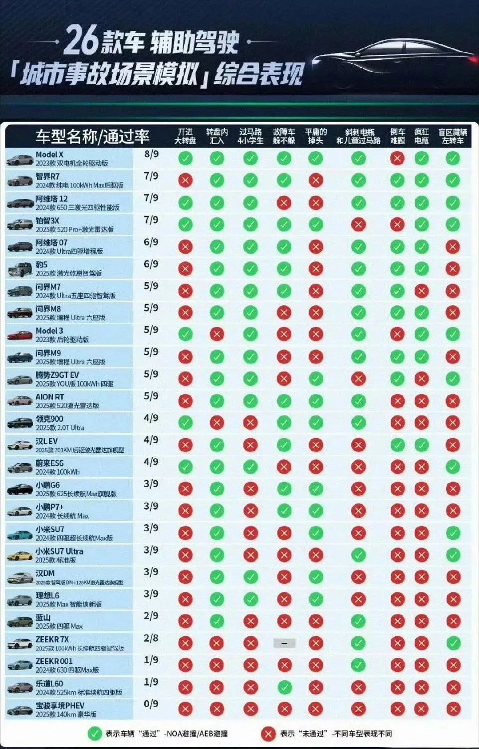 出人意料的是没有一辆车能够在高速和城区两个项目场景中零失误。更为颠覆印象的是国产智驾跟特斯拉测试成绩差距显著,高达15款国产车型在6个高速场景里全部挂0。特斯拉2023款的特斯拉Model 3后轮驱动版和Model X双电机全轮驱动版位列前二,高速6个事故场景模拟中只有1个不通过,断层领先下面的其它车型。