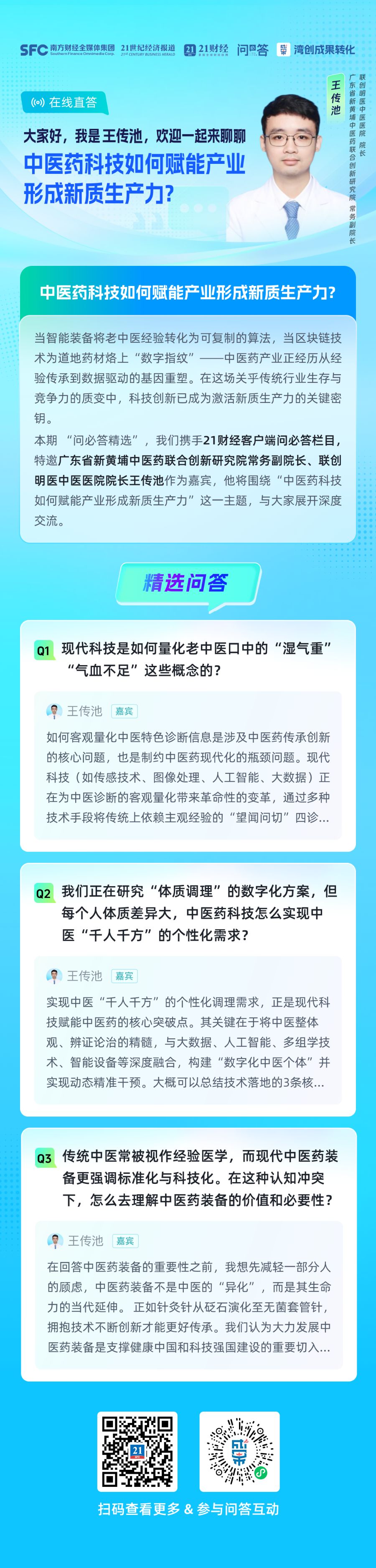 本期“问必答精选”,我们与大湾区科技创新中心旗下“湾创成果转化平台”联合举办,并邀请广东省新黄埔中医药联合创新研究院常务副院长、联创明医中医医院院长王传池作为嘉宾 ,他将围绕 “中医药科技如何赋能产业形成新质生产力” 这一主题,与大家展开深度交流。
