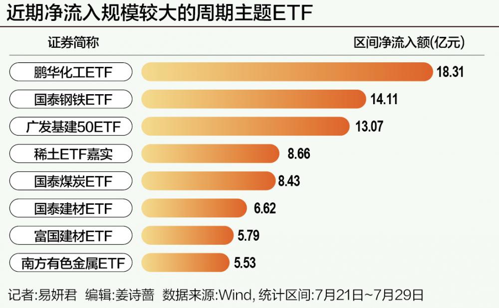 据Wind统计,截至7月29日,鹏华化工ETF、国泰钢铁ETF、广发基建50ETF自7月21日以来净流入了18.31亿元、14.11亿元、13.07亿元,为近期最受欢迎的3只A股行业主题ETF。