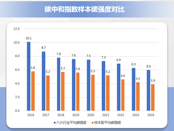 从减排成效来看,环交所碳中和指数样本股的碳排放强度较行业平均水平显著下降。在2016-2024年间,年均下降比例为32.87%。此外,环交所碳中和指数样本平均碳强度也呈现逐年下降趋势,2024年较2016年碳强度累计下降32.76%。