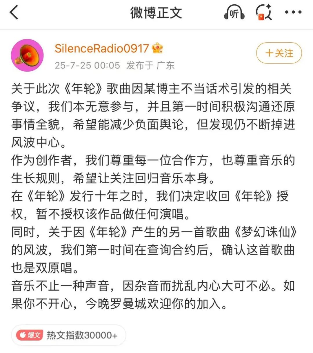 那边,双原唱各自的声明却引发了粉丝互攻的“双输”结果。汪苏泷工作室于7月25日凌晨发布博文,表示“第一时间积极沟通还原事情全貌......但发现仍不断掉进风波中心......决定收回《年轮》授权,暂不授权该作品做任何演唱”。随后,张碧晨工作室发文称:“张碧晨女士是《年轮》唯一原唱这一事实清晰明确,无可争议。”并提及,“值此《年轮》发行十周年之际,好好和这首作品告个别。”