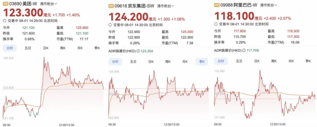 消息发布当天,美团(3690.HK)、京东(9618.HK)、阿里巴巴(9988.HK)等港股平台股价全线上涨,美团盘中涨近3%,阿里涨超3%。