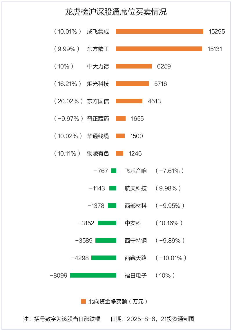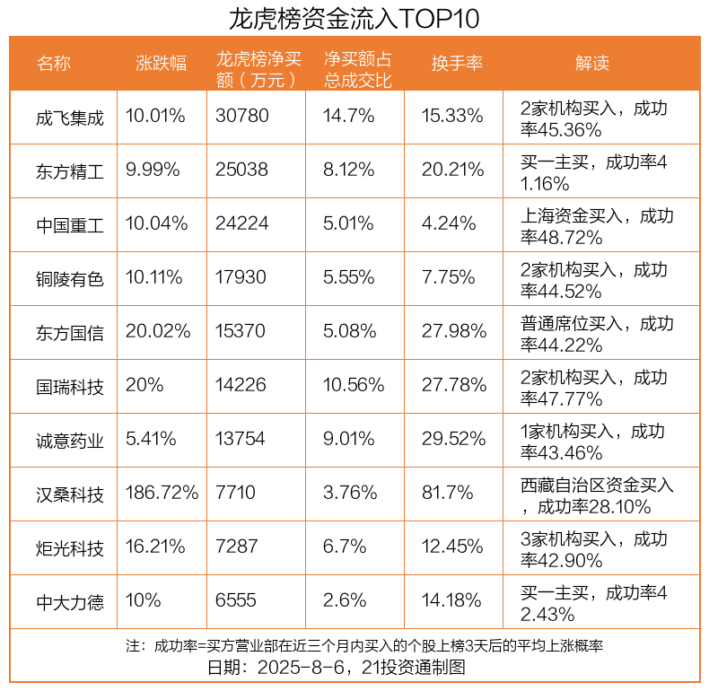 8月6日,上证指数上涨0.45%,深证成指上涨0.64%,创业板指上涨0.66%。盘后龙虎榜数据显示,共有54只个股因当日异动登上龙虎榜,资金净流入最多的是成飞集成(002190.SZ),达3.08亿元。