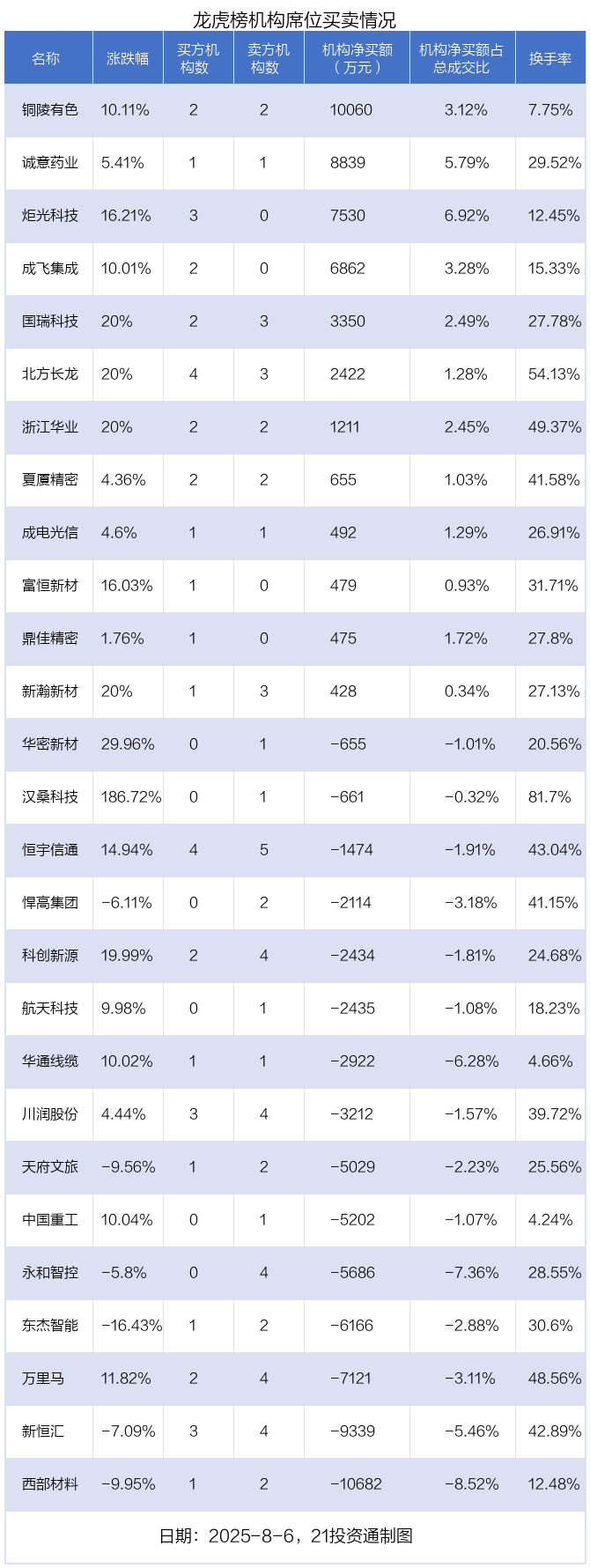 其中,机构净买入金额最多的是铜陵有色(000630.SZ),当日收盘上涨10.11%,换手率为7.75%。