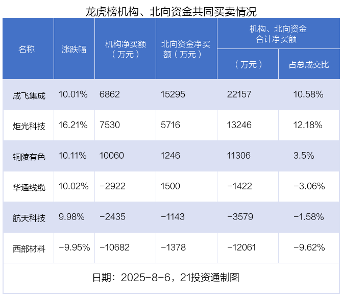 值得注意的是,机构和北向资金共同净买入了成飞集成、炬光科技、铜陵有色等3股;共同净卖出了航天科技、西部材料等2股;在华通线缆上出现分歧,机构净卖出华通线缆2922.38万元,北向资金净买入1500.22万元。