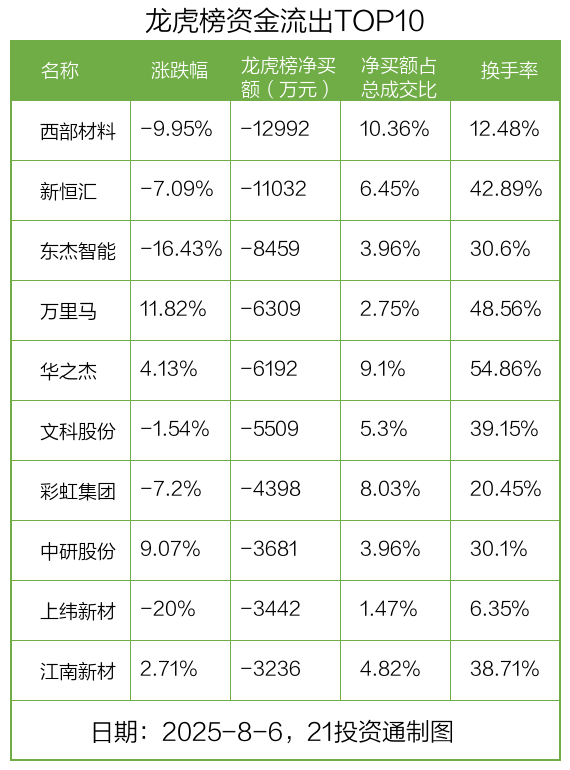 而龙虎榜中资金净流出最多的是西部材料(002149.SZ),被净卖出为1.3亿元,占总成交金额的10.36%。西部材料收盘下跌9.95%,换手率为12.48%。