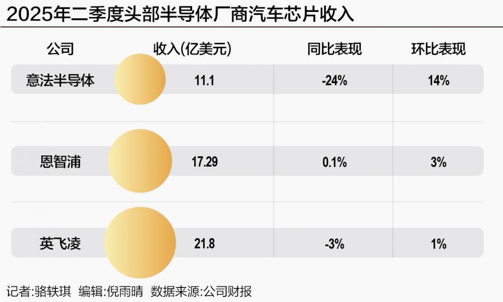 英飞凌的描述与意法半导体略有类似。财报显示,在二季度,公司汽车业务收入同比减少3%、环比增加1%。随着客户去库存趋势放缓,收入略有改善;但部分客户因财务限制而面临进一步降低库存目标的风险。