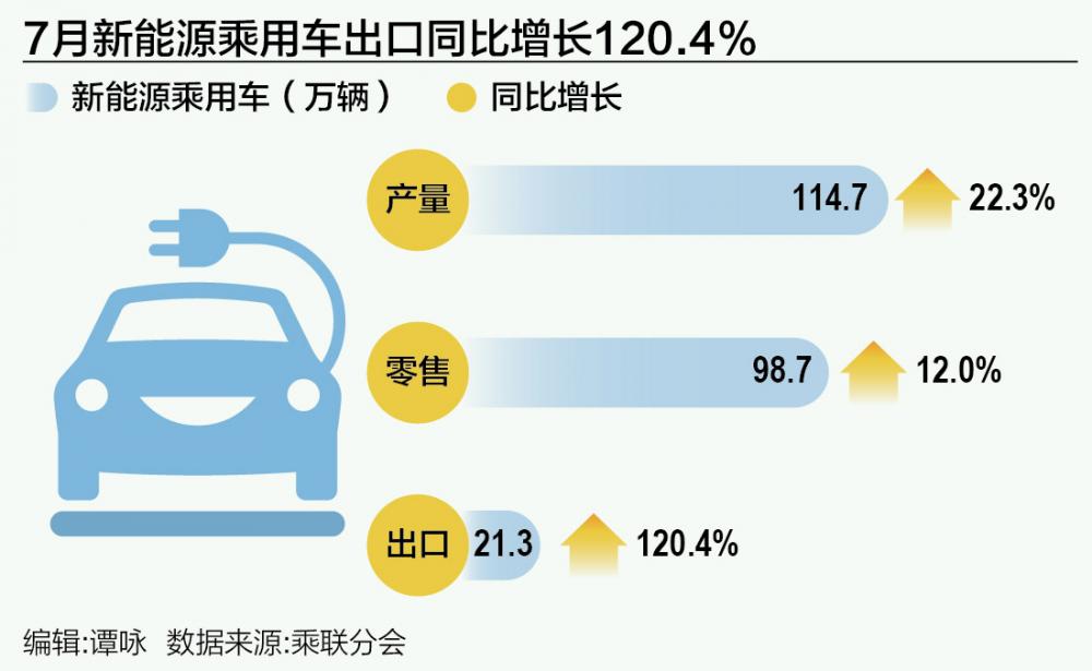 乘联分会数据显示,7月新能源乘用车出口21.3万辆,同比增长120.4%,环比增长7.6%;占乘用车出口44.7%,较去年同期增长近20个百分点。