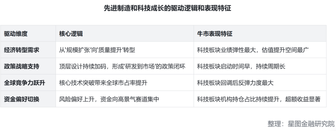 先进制造和成长科技之所以成为牛市主要驱动力,本质是中国经济转型、政策支持与全球竞争力提升共振的结果,这种“时代必然”决定了其在牛市中的领涨地位。