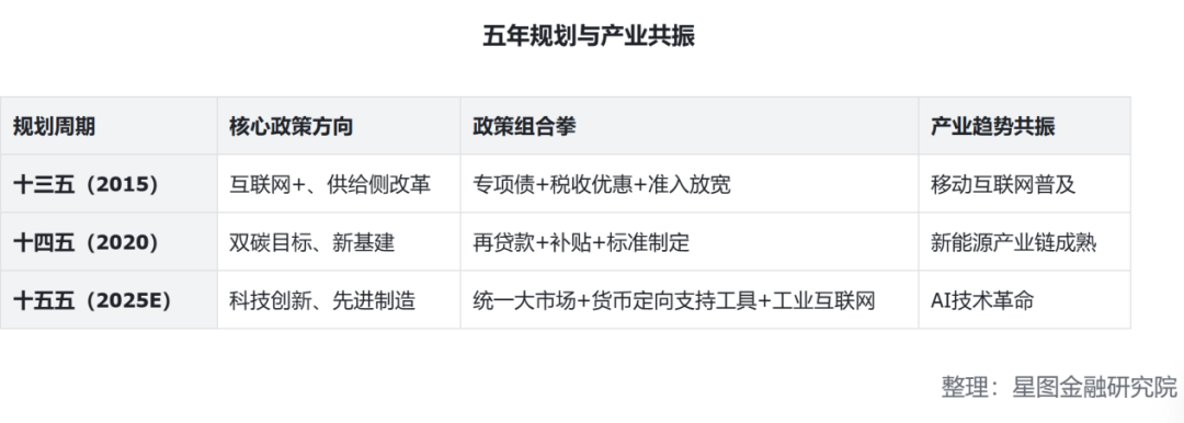 产业周期与政策周期的叠加放大了行情弹性。规划交替期往往对应经济结构转型的关键节点,政策方向与技术革命形成共振:2015年“互联网+”政策与移动互联网用户爆发式增长共振,催生TMT板块牛市;2020年“双碳”目标与全球新能源产业链爆发叠加,推动相关板块领涨。当前“十五五”规划聚焦的“AI+先进制造”,正与全球人工智能技术革命形成交集,这种政策与技术的共振有望复制历史行情。