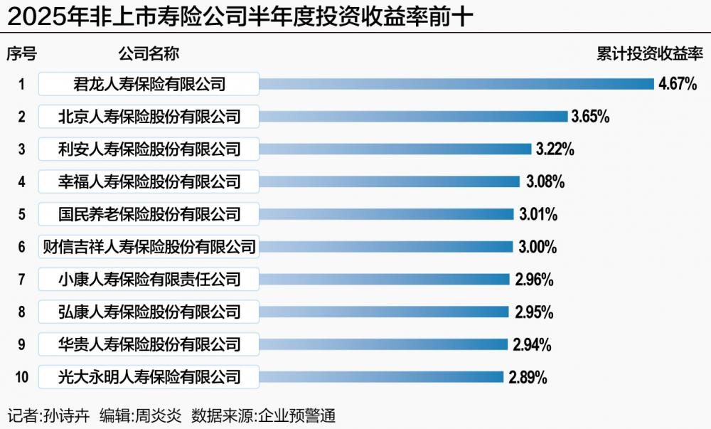 从上半年投资收益率来看,59家非上市寿险公司中有6家超过3%。其中,君龙人寿保险有限公司以4.67%的收益率位居榜首;北京人寿保险股份有限公司紧随其后,收益率为3.65%;利安人寿保险股份有限公司以3.22%位列第三;幸福人寿保险股份有限公司、国民养老保险股份有限公司、财信吉祥人寿保险股份有限公司分别为3.08%、3.01%、3.00%。