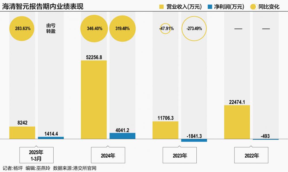 具体来看,2022年、2023年、2024年及2025年1~3月(简称“报告期”),海清智元的收入分别约2.25亿元、1.17亿元、5.23亿元及0.82亿元,对应的净利润分别约-493万元、-1841.3万元、4041.2万元及1414.4万元。