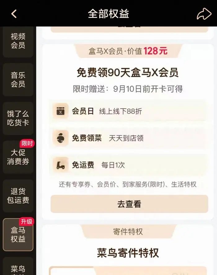 在盒马X会员全面撤离之际,几乎同一时间,淘宝88VIP会员页面上,却打上了醒目的“免费领90天盒马会员”广告。