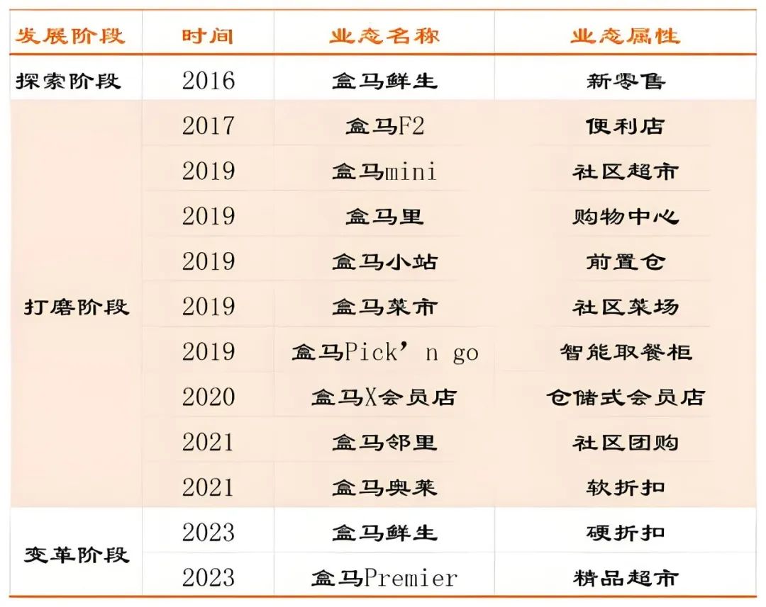 2019年开始,盒马放缓了扩张速度,转而探索不同的业态,包括便利店盒马F2、社区超市盒马MINI、前置仓盒马小站、邻里商业盒马NB、折扣超市盒马奥莱等。
