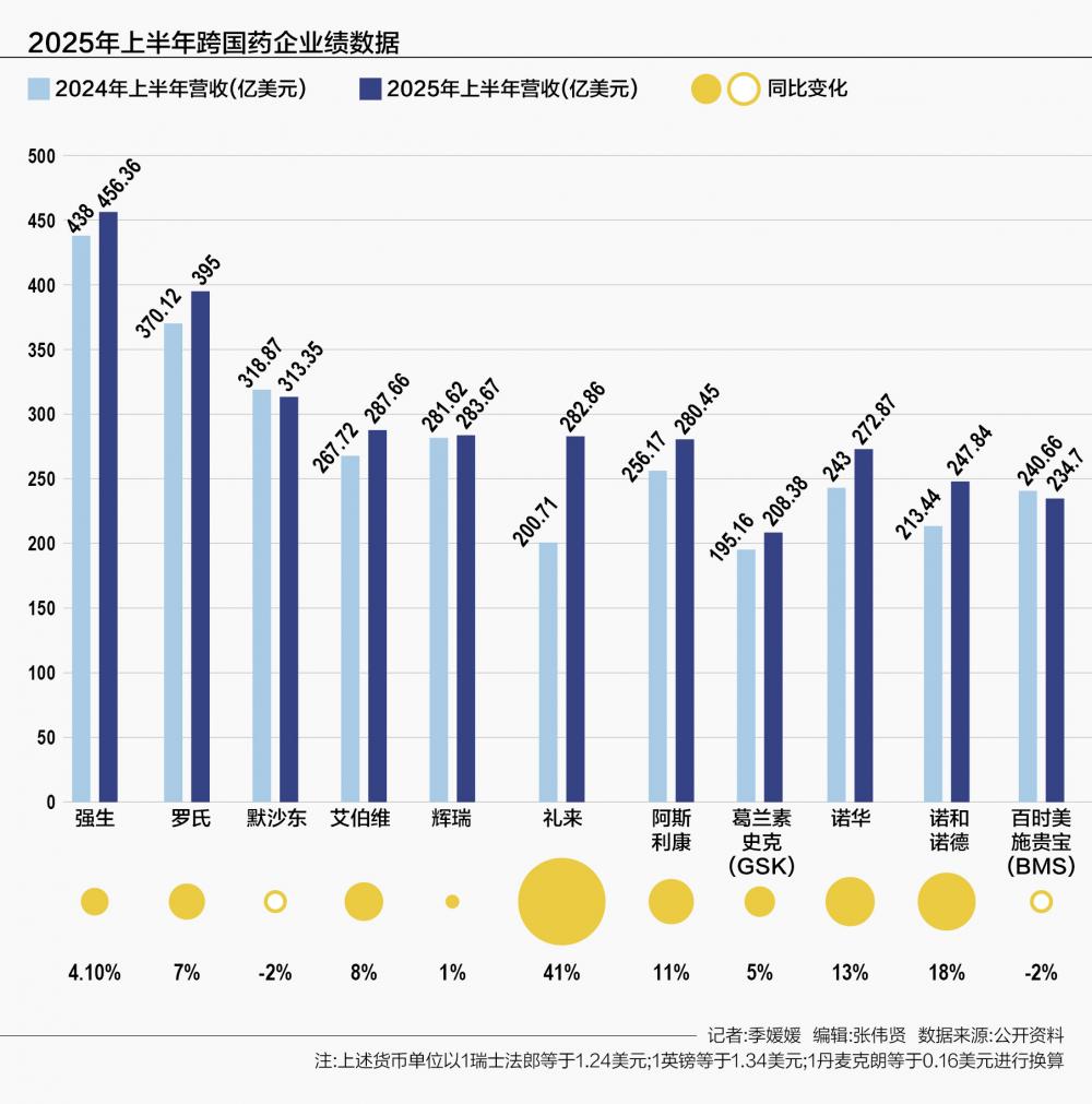 21世纪经济报道记者梳理发现,从上半年总营收来看,强生凭借着创新制药、医疗科技两大板块以456.36亿美元的成绩稳居榜首,也是唯一突破400亿美元大关的企业;礼来与诺和诺德凭借GLP-1类减肥药及糖尿病治疗药物的持续放量,上半年营收增速稳居行业榜首;阿斯利康、诺华等药企则凭借创新药和新兴市场实现稳健增长。但与之形成对比的是,默沙东、百时美施贵宝(BMS)等则因成熟产品收入下滑,短期业绩承压明显。