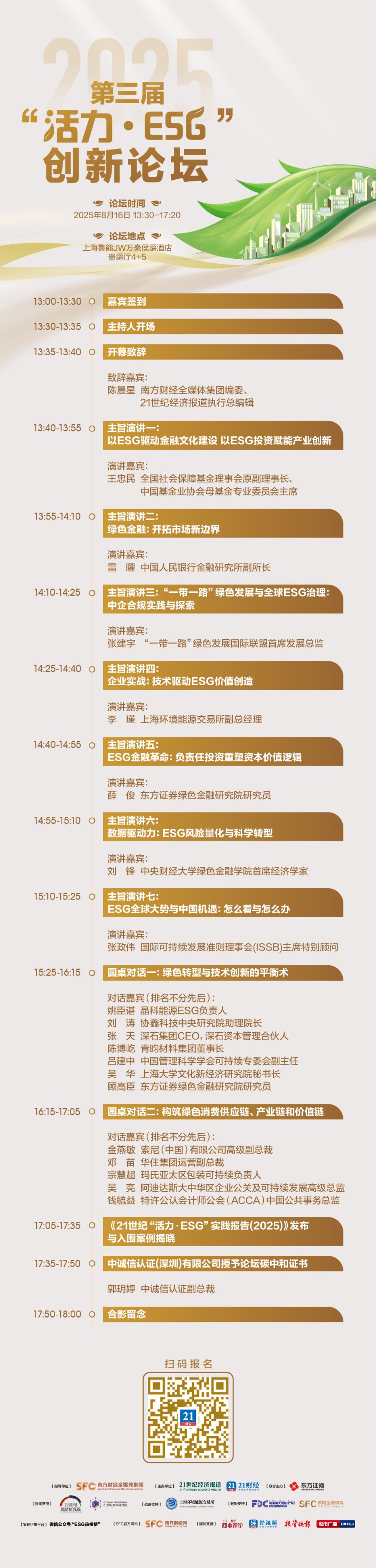 在全国生态日即将到来之际,8月16日,由南方财经全媒体集团指导、21世纪经济报道主办的第三届21世纪“活力·ESG”创新论坛将在上海隆重举办!