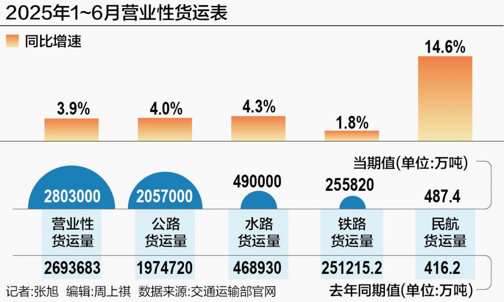 交通运输部提供的数据显示,上半年,全国货运量平稳增长,国际运输韧性较强。上半年,完成营业性货运量280.3亿吨,同比增长3.9%。铁路、公路、水路、民航货运量同比分别增长1.8%、4.0%、4.3%和14.6%,其中,中国航运企业完成的远洋货运量同比增长9.4%。快递业务量完成956亿件、同比增长19.3%。