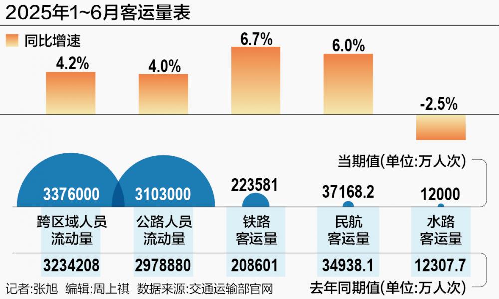 人员出行持续旺盛,民航国际客运量快速增长。上半年,完成跨区域人员流动量337.6亿人次,同比增长4.2%。分方式看,铁路、水路、民航客运量同比分别增长6.7%、下降2.5%和增长6.0%,公路人员流动量同比增长4.0%,其中,民航国际航线客运量同比增长28.5%。