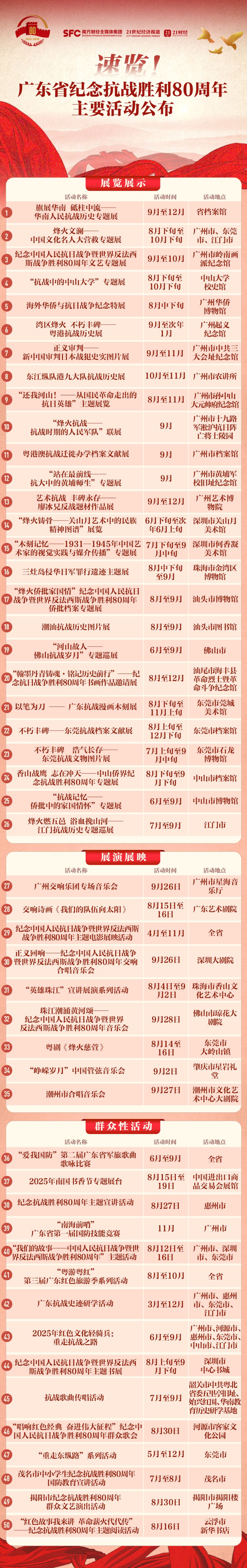 在中国人民抗日战争暨世界反法西斯战争胜利80周年之际,广东将举行系列专题研究和学术研讨、系列专题展览和优秀文艺作品展演等50余项系列活动,团结动员亿万南粤儿女更好地铭记历史、缅怀先烈,为强国建设、民族复兴作出新的贡献。