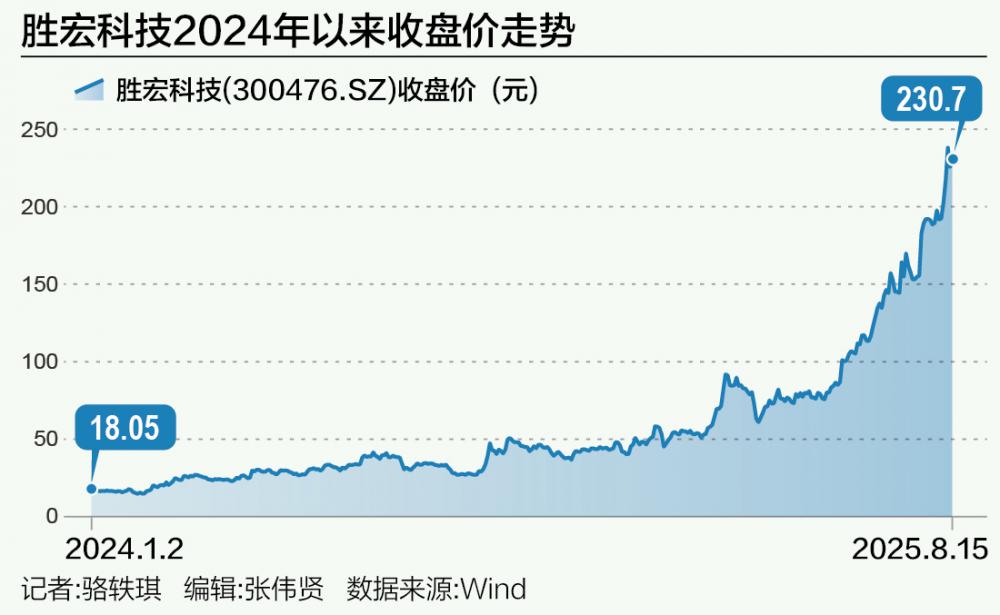 其中,胜宏科技股价从年初41.54元/股(前复权,下同),涨至8月15日的230.70元/股,涨幅达到452%,最新市值1990亿元,被市场视作“英伟达链”重要标的。此前8月13日,其股价更达到238元/股,市值超过2000亿元。