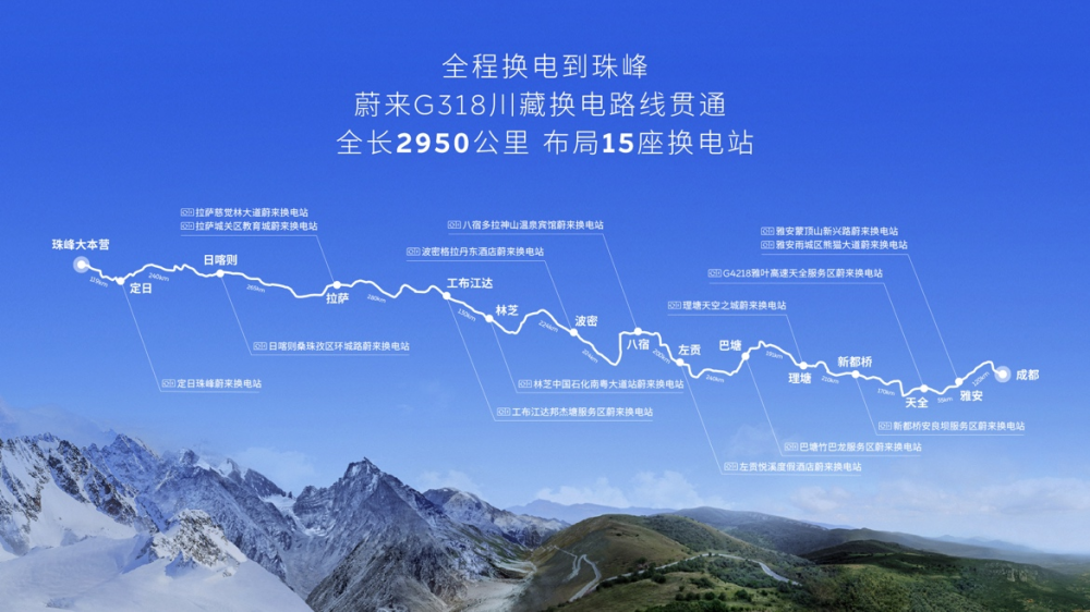 这条换电路线全长2,950公里,由成都出发,沿途共布局15座换电站,终至珠峰大本营脚下的定日县。这也意味着G318川藏线上平均每200公里就有一座换电站,蔚来车主可以通过全程换电直达珠峰大本营,燃油车能去的地方,蔚来和乐道用户都能去。伴随着蔚来G318川藏换电路线贯通,蔚来的充换电站建设也正式进入攻坚加密新阶段。