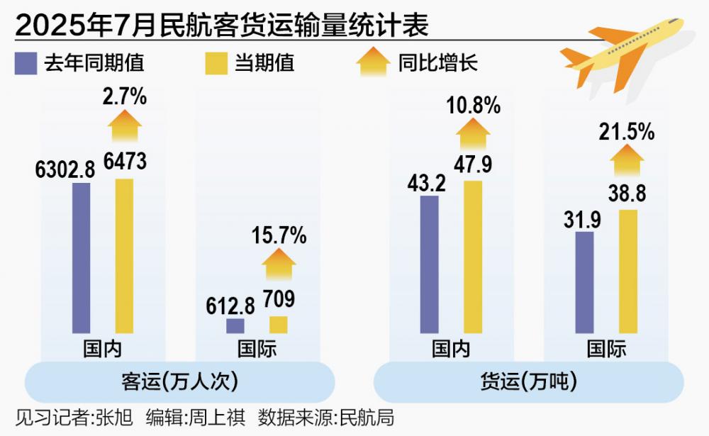 民航局近日公布的数据显示,客运方面,7月国内航空市场完成旅客运输量6473万人次,同比增长2.7%。国际航线完成旅客运输量709万人次,同比增长15.7%,规模创历史新高。