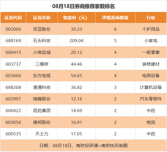 从券商推荐家数来看,8月18日有83家上市公司得到券商推荐,其中百亚股份获得6家推荐,石头科技获得5家推荐,小商品城获得4家推荐。