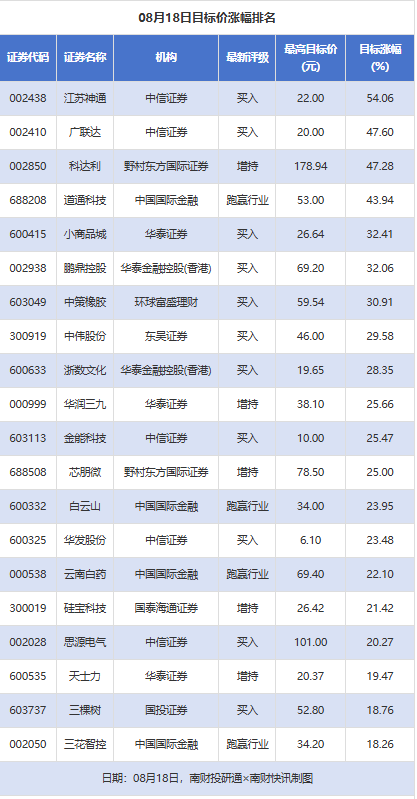 南财投研通数据显示,8月18日,券商给予上市公司目标价共37次,按最新收盘价计算,目标价涨幅排名居前的公司有江苏神通、广联达、科达利,目标价涨幅分别为54.06%、47.60%、47.28%,分别属于通用设备、软件开发、电池行业。
