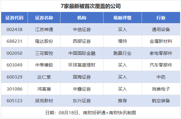 首次覆盖方面,8月18日券商共给出了7次首次覆盖,其中江苏神通获得中信证券给予“买入”评级,隆达股份获得西部证券给予“增持”评级,三花智控获得中国国际金融给予“跑赢行业”评级,中策橡胶获得环球富盛理财给予“买入”评级,达仁堂获得国海证券给予“买入”评级。