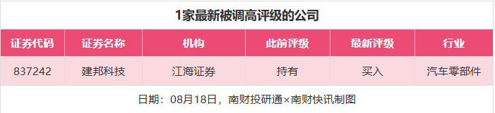 评级调高方面,8月18日,券商调高上市公司评级达到1家次,最新数据包括了江海证券对建邦科技的评级从“持有”调高至“买入”。