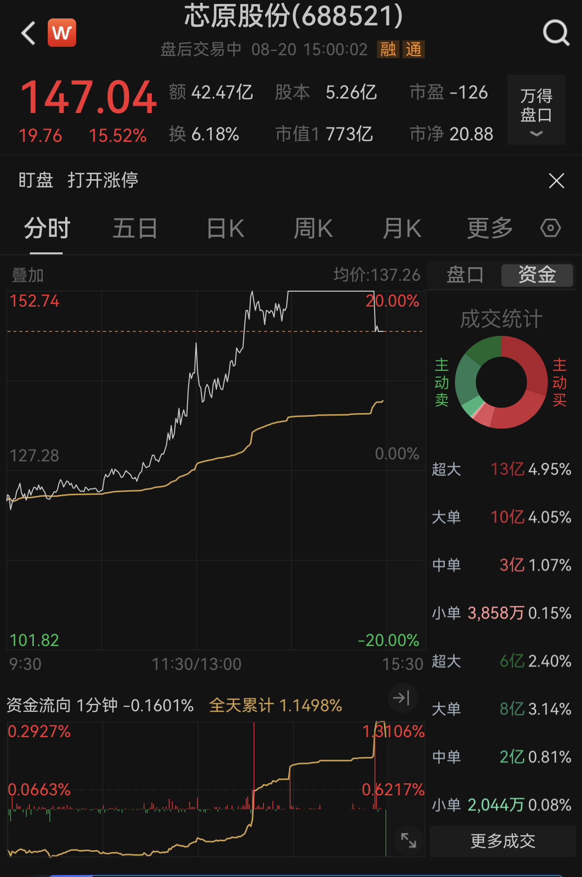 8月20日,芯片龙头股芯原股份(688521.SH)盘中强势触及20%涨停,但尾盘却突发炸板。截至当日收盘,芯原股份报收147.04元/股,日涨幅15.52%,成交金额42.47亿元,总市值达773亿元。