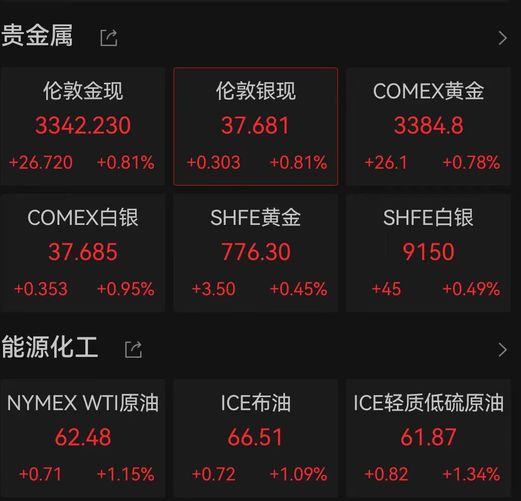 其他资产中,现货黄金涨0.8%至3342美元/盎司,10年期美债收益率下行超1个基点至4.3%附近,美元指数转跌,国际油价走高,美油涨1.15%至62.45美元/桶,布油涨1%至66.5美元/桶。