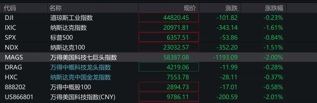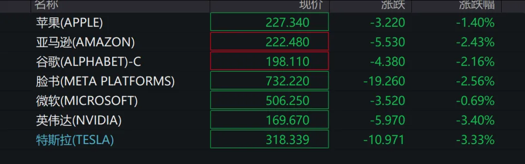 美股科技股下跌,万得美国科技七巨头指数跌2%,英伟达、特斯拉跌幅超3%,亚马逊、谷歌、脸书跌超2%。