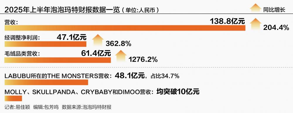 8月19日,泡泡玛特国际集团发布2025年半年报,财报显示,上半年泡泡玛特营收138.8亿元(人民币,下同),同比增长204.4%,经调整净利润47.1亿元,同比增长362.8%。值得一提的是,2025年上半年的营收、净利润均超过2024年全年。