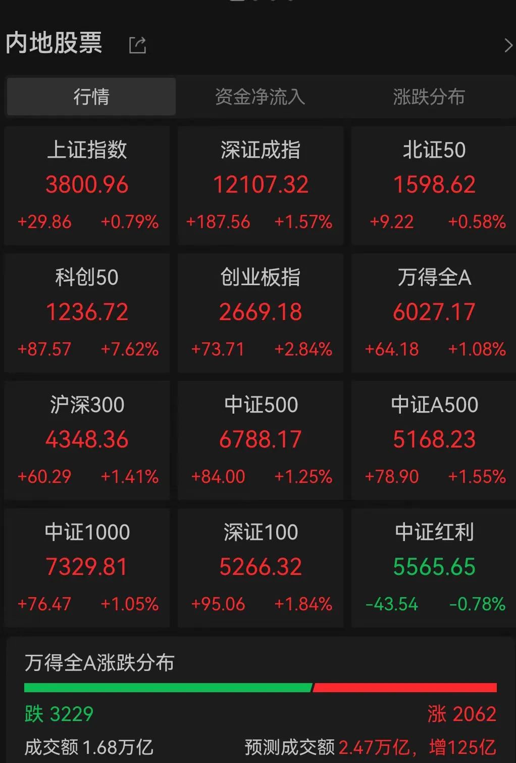 8月22日午后,A股各大指数继续走强,截至13:14,沪指突破3800点,创业板指涨2.84%,科创50指数涨逾7%,A50指数直线拉升。沪深两市合计成交额1.68万亿元,市场热点集中在算力和芯片方向,个股跌多涨少,全市场超3200只个股下跌。